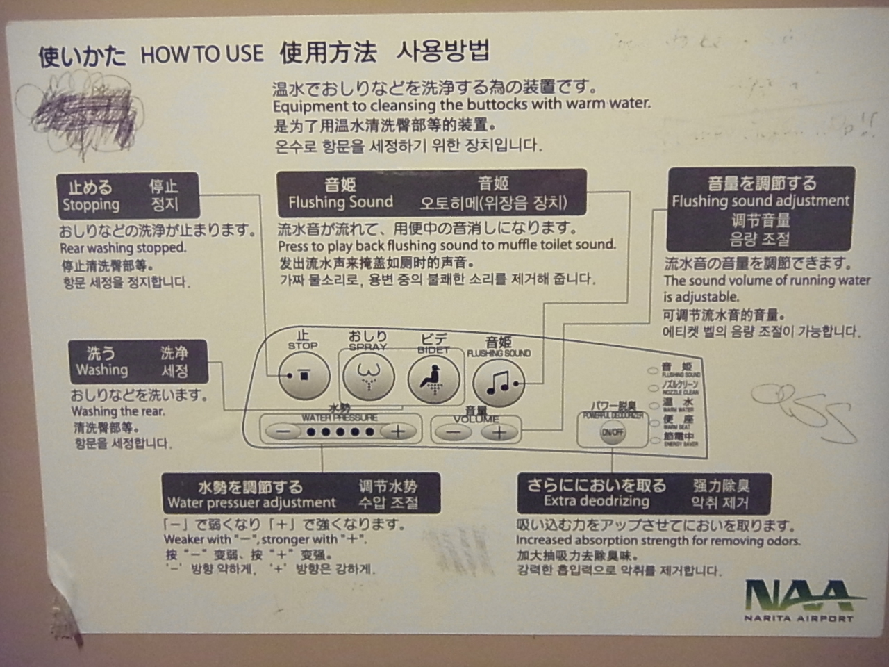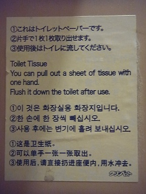 私の中国語のブログというのは自分の中国語学習のために書いている。先生(中国人の友人)や娘に直してもらってアップしているが、中国語だと小学生の作文レベルになっちゃうし、難しい表現は所詮知らないので、直させる箇所も多くない。それでもたとえば「但是我不能确定完全对」を娘に「但我还是不能确定完全对」と直されて、ふーむと唸る。 ヤフーブログのときにもネタにしたけど、日本のトイレの中国語表記があまりよくない。でも今回帰国して「ずいぶんよくなったのでは?」と感じた。何よりね。写真を撮るとき「カシャ」という音で変態かと思われないか慎重なんだから、アタシ。カメラ構えて、水流してカシャとか。 ①是为了用温水清洗臀部等的装置。 停止:停止清洗臀部等。 音姬:发出流水声来掩盖如厕时的声音。 调节音量:可调节流水声的音量 洗净:清洗臀部等 调节水势:按“-”变弱,按“+”变强。 《强力除臭》加大抽吸力去除臭味。 見知らぬ中国人がコメントしてくれたので、感謝の意も込めてここに貼り付けておきたい。 MIDORI桑:这玩意在中国好像应该叫“洁身器”。“清洗臀部”这话似乎不怎么讲,也显得过于直白,可称为“冲洗下体”之类。你可以在网上下载一个较好品牌的洁身器使用说明书,那里面相应的中文词汇可能都有。仅供参考。 日本語「おしりなどの洗浄」を直訳して、「清洗臀部」。正しいといえば正しいけど、なんかあまりにもストレート。 2.可以单手一张一张取出。 3.使用后,请直接扔进座便内,用水冲去。 日本語で「これはトイレットペーパーです」と書く必要性が私には理解できない。横井庄一氏宛てか?英語は直訳していないのに、中国語は一字一字ご丁寧に直訳している。 请中国朋友帮我看看哪里用词不当。