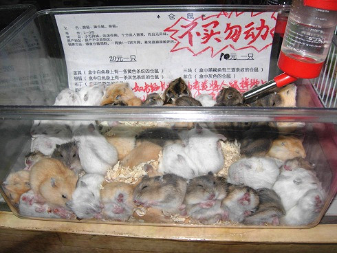 おまけ:劲松市场でハムスター(仓鼠)1匹10元または20元(種類による)で売っていた。きゃわゆいーー!でも要らない。手書き赤字で「不买勿动」(買わないんだったら触るなばっきゃろー)と書いてあるところに注目。