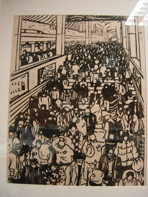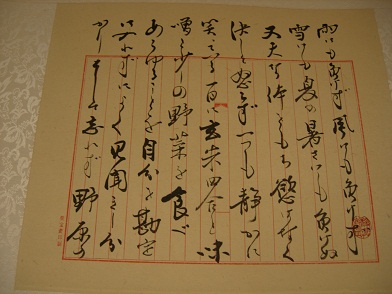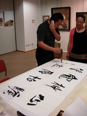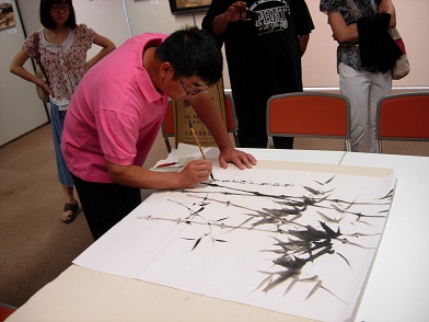 予め書道組に「筆持参」が言いつけられていて、席上揮毫があった。書道組は4人で、日本人3人、中国人1人。その中国人とは北京師範大学で書道を教えている陈小林老师。普通字は紙の右から書くのに、筆がいきなり左端に落ち、「一」をいくつか書くので、何が始まるのかと思ったら、竹だった。字じゃなくて、絵だった。その後、紙を90度ずらして、葉や節を描いていった。 和田さん、竹尹さん(通称LEMOちゃん)、私が書いた後、飛び入りの揮毫あり。尚丁さんという油絵が専門の画家は「我没练过」(書道はやったことない)と言いつつ、さらさら書き、携帯が鳴って電話に出ながらも、その筆は止まらなかった。書いたのは「心曠神怡 寵辱皆忘」。 あ、この図の不思議なところはなぜ左の耳で聞かなかったのかってことなのよ。 展示はこんな感じ(次回もっとちゃんと写真撮ってくるわ)。 私、自分の撮るの忘れた(おいおい)。展覧会記事まだまだ続く。 PR |