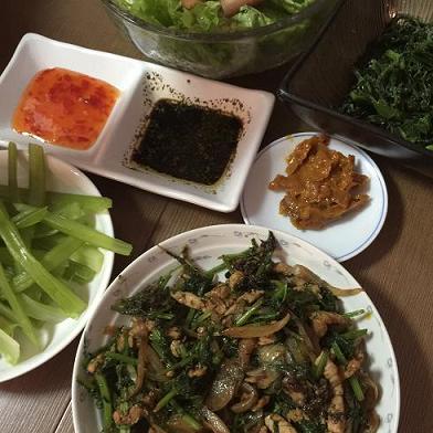 先週末独身女子がやって来て、前日はろくに寝てないって言うし、普段ろくなものを食べてないだろうと思い、いろいろ作った。ポン酢を日本から持ってきていると言うから、現地生産のがあるよと教えた。