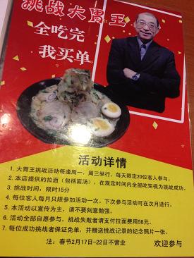 1. 「大盛りラーメン完食したらタダ」という試み、北京で初めてかな。いろいろ条件はあるけど(月、水のみ。20人まで。15分以内等)、実際どのくらい挑戦しているんだろう?大食いとか私は好きじゃないけど、この情報が有難い輩は行くがいい。