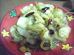3. 干煸豆角 5.醋溜白菜 白菜は厚みが残らないように斜めに切る。中華鍋に油を入れて、唐辛子を入れ、香りが出たら、長ネギを入れる。その後すぐに白菜を入れて、1分炒める。その後、酢、醤油、砂糖、塩を加えて3分炒める。水溶き片栗粉を入れとろみが出たら、最後にごま油を入れる。