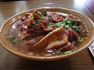 双井でカンフーパンダ2を見た後、地下のフードコートへ行った。あれだけある食べ物の中から、息子が選んだのは「卤煮火烧」。私と子ども二人、結局2椀頼んだ。結構イケた。 首都図書館へ行ったとき、下のフードコートで「卤煮火烧」とあるのを私は見逃さず、頼んでみた。息子が目の色を変え、パクっと食べて一言「芝麻酱が入ってない」。私は息子が『美味しんぼ』の山岡さんに見えた。確かに「腐乳」の味ばかりが口に残った。しかもなんか清潔感がない。危なそうに感じて結構残した。 そして今日。文鳥カフェに入る交差点を左(西)に曲がらないで、そのまま北へ3軒目くらいかな。大きく看板に「卤煮火烧」とあり、一人で入って食べた。おいしかった。危なそうじゃなかった。 「卤煮火烧」……猪下水(就是猪内脏。豚の内臓)を調理したもの。詳しくは中国語で百度百科へ。老舗も載っている。 自分で作りたいヒトは(いないだろうけど)→美食天下参照。 |