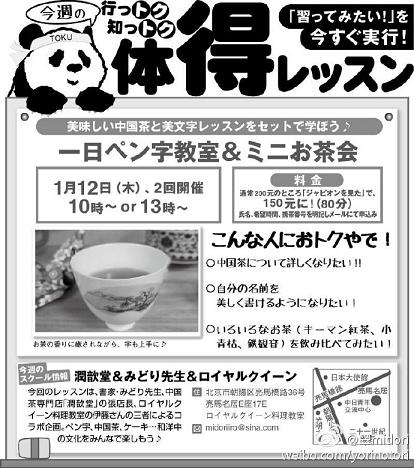 日時:1月12日(木)10時からまたは13時から 会場:ロイヤルクイーン(朝阳区亮马桥路36号亮马名居E座17E) 内容:名前を中心に漢字の練習をします。名前が上手になりたい人は是非! 参加費:(通常200元を「ジャピオン見た」で)150元 お茶は祁门红茶,小青桔,铁观音の三種を試飲していただきます。 お茶に関する質問もどうぞ。中国茶の販売もします。ケーキ付き。 前日までにメールでmidoriiro★sina.com(★を@に)へ 氏名、希望時間、携帯番号を明記して申込みください。 前日までに連絡すれば、買いたい中国茶を持って来てもらえる。私はこのみかんに入ったプーアル茶をお土産用に欲しい。 |