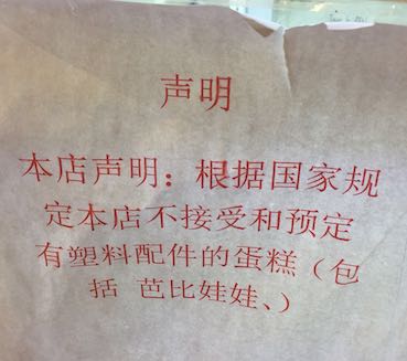 このように人形が本体になっている。中には「泡泡浴蛋糕」といって、「いっい湯だな、はははーん」的な図も。 マグマ??溶岩? 先月、一緒に行った日本人がパン屋(ケーキ屋)で隠し撮りした。 上の写真のような、プラスティック(バービー人形等)を使ったケーキは、国でダメと決まっているので、予約受け付けませんって。そんな規定が出たんだね。 しかしながらここは中国。この張り紙のすぐ横の見本は以下のとおり。 え?えええ?これらはプラスティックだよね??そして、ほかのケーキも趣味悪い。 マカロンの後ろの方の色が濁っている。 傘の柄がストローで超ちゃちい。 これは「人名入れます」と言いたいのか。ど真ん中が「蒼井そら」だ。 今日ケーキを買うか、考え中。 Happy birthday to me. |
