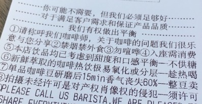 私はコーヒーを飲もうと思って、一人で福叁cafe(大众点评)へ。 平屋の梁(はり)はみんなこうだよなあ。一番初めに住んだアトリエと同じだと思い出した。画家村のレストランへ言っても、いつも思う。北京の平屋はこう作るのかと。 美式咖啡25元。 今、ネットで見たら、「污咖啡」という妙なネーミングのアイスコーヒーがあった。 話は逸れるが、このすぐ南(杨梅竹斜街)にSoloist Coffeeがあって、行ったことがある。ブログで記事にしたことあるけど、執拗なこだわりがレシートに書いてある。 「请称呼我们咖啡师」(服务员なんて呼ぶんじゃない!バリスタ様なんだから) 「本店饮品均已考虑到甜度和口感平衡---不供糖」(砂糖入れるお子ちゃまは来なくていい) 以上のように自信満々。私はミルクも砂糖も絶対必要だし、人によってコーヒーの好みはまちまちなのだから、用意するべきだ。砂糖を出さないカフェって日本にあるの?北京で経験したのはあと一店。1年前オープンした時行った、四葉グループ「万葉」ではっきり「砂糖を入れなくても美味しいので」と中国人服務員に言われた。「驕れる者久しからず」という平家物語の一文をぼやきたい。 まあ、それを差し引いても、Soloist Coffeeのコーヒーは普通だった。日本人の友人も「味、普通」。同じことを言った。家で淹れてもコーヒーは美味しいよね。 でも、おととい飲んだ福叁cafeのコーヒーは美味かった。いやいや、砂糖入れたからじゃないよ。私の好みの問題かもれないが。ケーキ頼まなかったけど、美味しそうだった。 この店、こじんまりしている。満席。私は一人だったから、相席になったくらい。客がとても静かで良かった。 この日は風も強く、空気質量指数も低かった。外に出たら、空は水色から深い紺青色に変わっていた。ぼんやりしていた私の心は、冷気も手伝い、瞬時に醒めた。 そして、バスで帰ったとさ。 <完> |