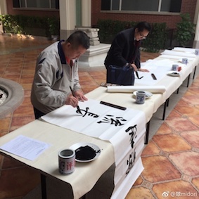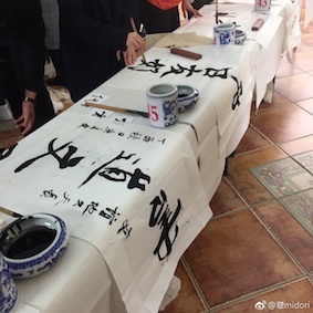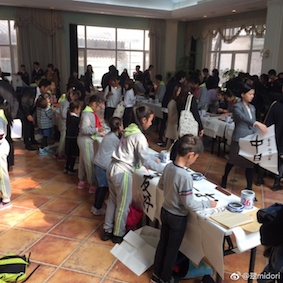 午前中100人の学生は二組分かれて書いた。50人が書いている間、後の50人は見学。横に審査員の先生が書くスペースがあり、中国人の先生達が揮毫していた。私も「筆と印を持ってきてください」と言われていたので、覚悟していたが、書かなかった。