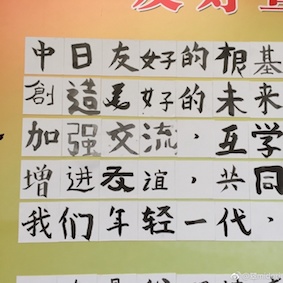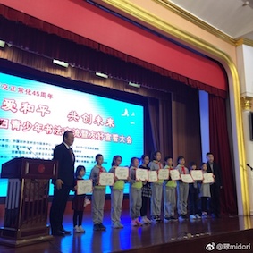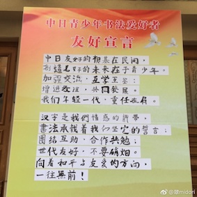 天井が高く、重々しい、古い建築だ。ここで小学生から大学生までの日中両国の計100人が集い、揮毫。一つ目は全員同じで「中日友好」、二つ目は内容は自由で、書いたあと隣の外国人と交換。 すごいんだよ、中国人の子ども達。 例えば楷書。ハネはハネる前にしっかり止めて、溜めて、戻って、ハネる。中国人が大好きな顔真卿だ。行書も器用に書くし、隷書、篆書まであった。 小学生は日本人学校から希望者が参加したのだが、数からして分母が少ない。中国の小中高で毛筆は必修ではないので、中国人で書けるということは、学校外習っているということだ。 こっちの習い事は小さい頃からプロを育てるかのような厳しさ。うちの子は両方ともピアノを習ったが、指の形からして指導がものすごく厳しかった。趣味レベルというのが通じない。先生もそうやって教育を受けて来た人達だから。 今回、中国の子がたいていしていたのは、紙を綺麗に折ること。日本人でやっていた子もいたけど、四字書くのだから紙を四分の一に折る。普通はそうでしょう。でも、中国人は上下左右を空けて、四分の一に折っていた。 そして、自分の印と印泥を持っていて捺す。ご丁寧な子は「引首印」(右上に捺す印 )まで捺していた。書家ですかい! お昼を食べるのも、テーブルごとに中日混ぜて、私は審査員席で中国人の偉い先生達と一緒だった。お弁当が和食で、おにぎり、ハンバーグ、唐揚げ等。ハンバーグを指して、私に「これは豚?牛?」と聞く先生。いや、私はお店の人じゃないから!知らないけど、普通は牛でしょう。「ちゃんと確認できるまで口にしない!私は回民だから」。なるほど、中国でお弁当頼むときに、豚肉は入れない方が無難だな。 日本へ何度も行っている中国人の皆さん。20回は行ったという先生は隣の人に「日本は一回行ったら二回行きたくなる。二回行ったら三回行きたくなる」と言っていた。嬉しい。 お昼が終わって、学生の皆さんは庭へ。私ら審査員は賞状書き。手分けしてすぐ終わり、庭へ行くと宣誓式をやっていた。内容はこれ。 一人が一文字書き、100字。これを読み上げた。 敷地内に「平和の鐘」というのがあり、みんなで鳴らす。 「下」に続く。 おまけ:ニュースになっている。 1. 中日青少年交流书法共祝两国和平友好 2. 第二届中日青少年书法交流暨友好宣誓大会在京举行 ←主催した協会のサイトなので、詳しい。 |
