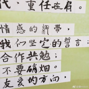 中国人って床で書かない。あんな大きな紙、よく机の上で書くよね。日本人は床に毛氈敷いて、紙全体を見ないと無理だわ。 ああ、だから書家の偉い先生でも紙を折るんだー。納得。 揮毫したホールのすぐ外にレンガが積まれた場所が見えた。相当古いんだろうなあと記念撮影。 表彰式。日本大使館、日本人学校、中国の中学、スポンサーの会社、スピーチがすごく多く、長かった。小学一年生もいるということは考慮されない。 審査員の一人である、日本人学校の先生が日本人の作品について講評をするときに、クイズを出した。「ひらがなの『あ』は元はある漢字です。さて何でしょうか」。そのあとは「『由』はひらがなのどの字になったでしょうか」。さすが、小学校の先生。喋るだけじゃない。こういうのでもないと、子ども寝ちゃうわ。 私はいろんな人に知り合えて、良かったよ。中国にいるんだから、筆は持って欲しいし、必修科目ではないが、中国人には書道の良さを知ってもらいたい。 赤入れたかったけど、そういう時間はなし。またどこかでイベントあるでしょう。社会貢献を真面目に考えている。 おまけ:一人一字、計100字、こんな感じ。 |