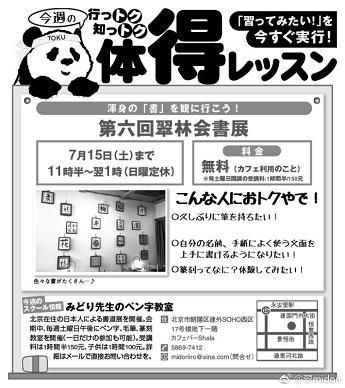 会期:~7月15日(土)11時半~25時 日曜定休 会場:カフェバーShala 建外SOHO西区17号楼地下一階 TEL:58697412 会期中は毎週土曜日午後にペン字、毛筆、篆刻教室を開催(一日だけの参加可)。 1時間半150元(子ども1時間100元) 申込み midoriiro★sina.com(★を@に) 今日午後2時からも教室あり。 毎週金曜日10時から「BAKER&SPICE」(亮马桥外交办公大楼1階)でペン字教室。 |